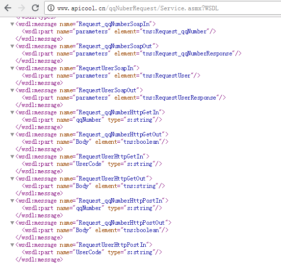 简易的API接口,可用来学习和入门,案例用户提交QQ号用户名并记录到数据库中。 案例地址: http://www.apicool.cn/qqNuberRequest/Service.asmx 服务名: RequestUser:用户名 Request_qqNumber:QQ号