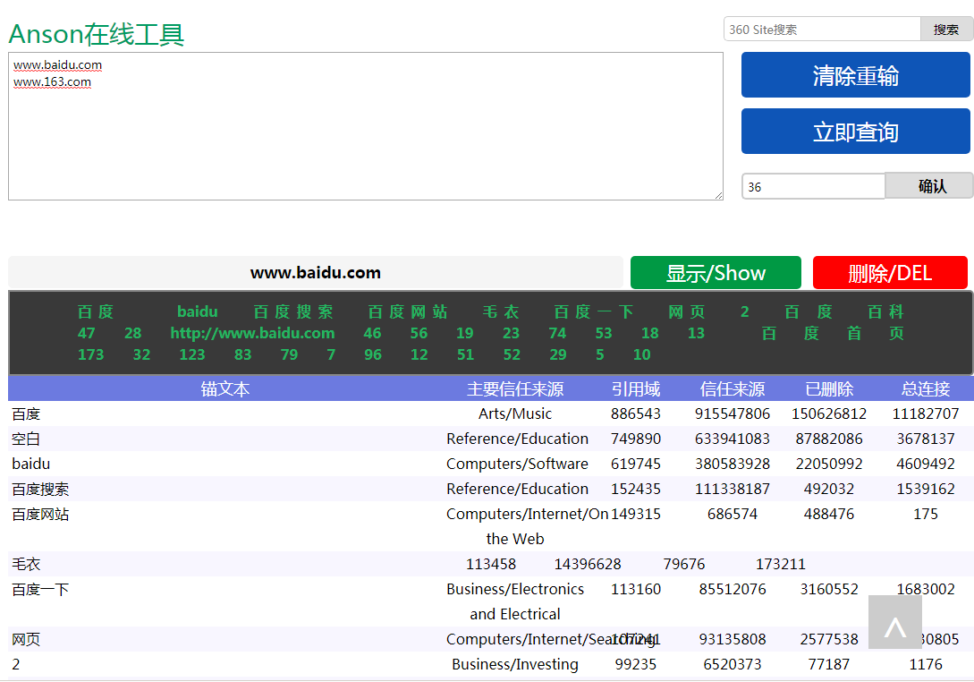 获取网站锚文本API接口 录入网站域名,可批量录入网站域名,显示各网站的锚文本信息,人工过滤可用信息。 案例地址: http://www.apicool.cn/tb822073037/index.html 在打开的页面中,录入域名,一行一个,然后点击“立即查询”,查询时间比较长,...